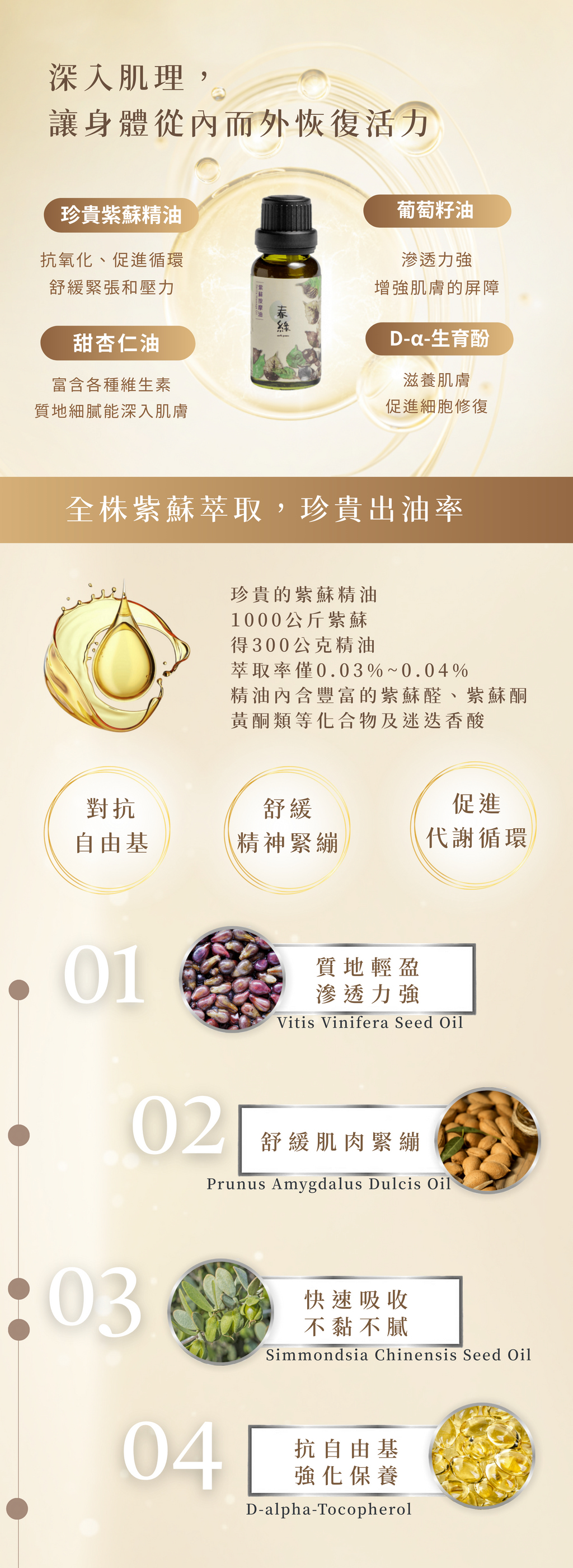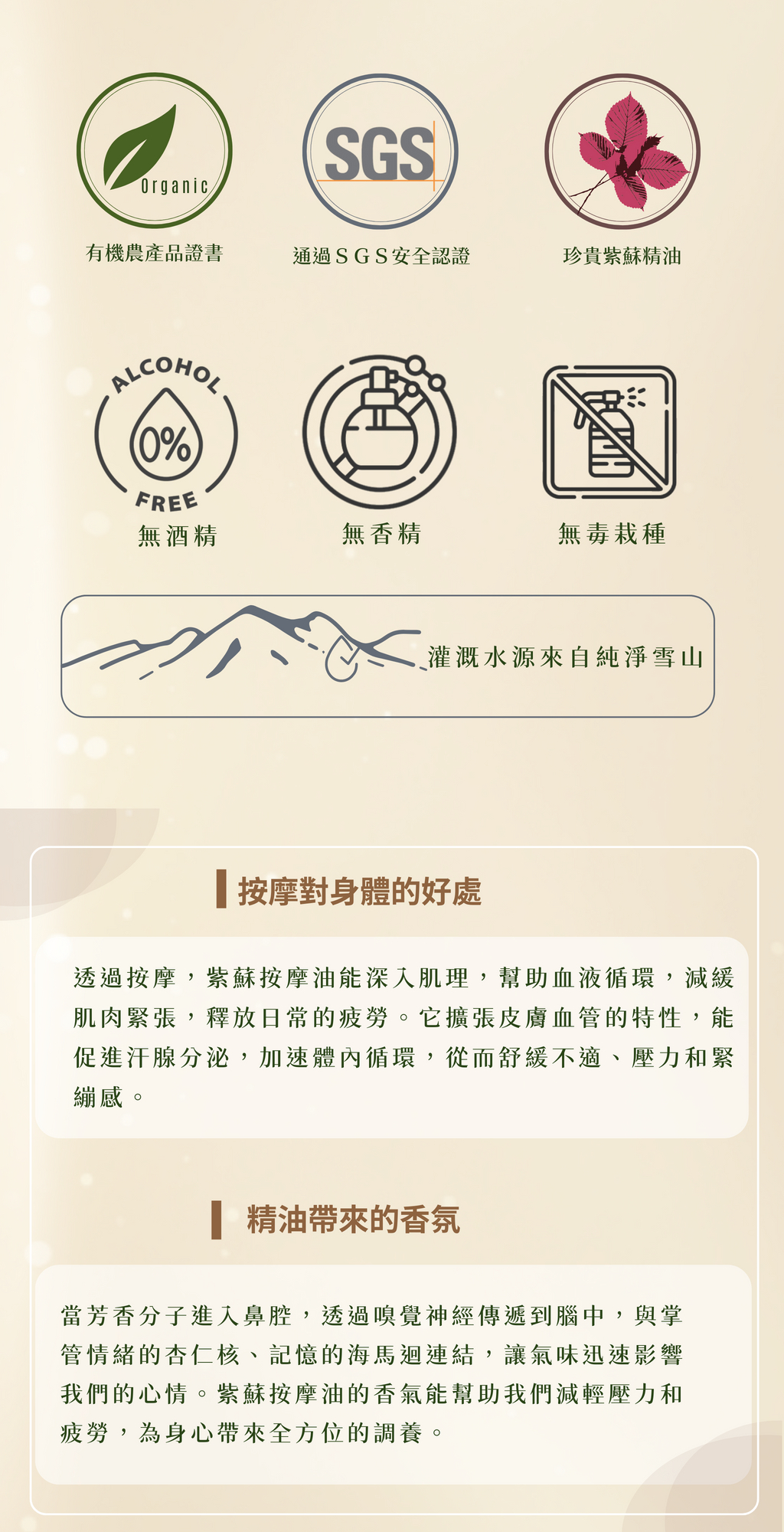 紫蘇按摩油質純溫和,但由於個人體質差異,建議使用前先諮詢醫師或相關專業人士。
